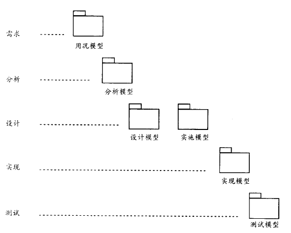 - 然后分析并设计系统来满足这些用况,这样便首先创建了一个分析模型,然后时设计模型和实施模型;进而在实现模型中实现该系统。