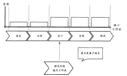 本阶段活动水平处于很低状态,这并不是说在本阶段没有大量的工作可做,而是几乎没有与需求、分析和设计工作流相关的工作。