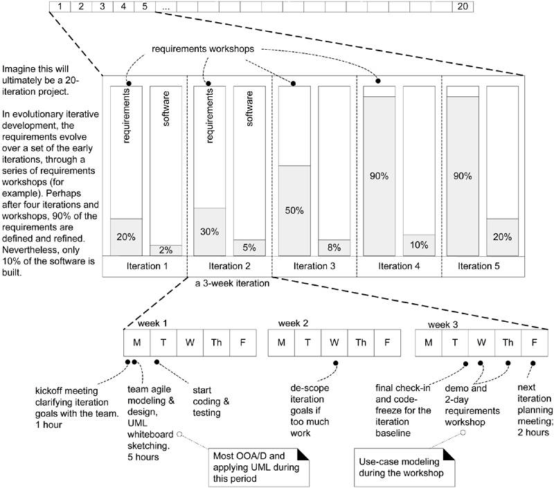 这里有个简短的例子,用以说明在运转良好的UP项目中,迭代方法是如何被运用的。这里假设项目交付前,最终酱油20次迭代。