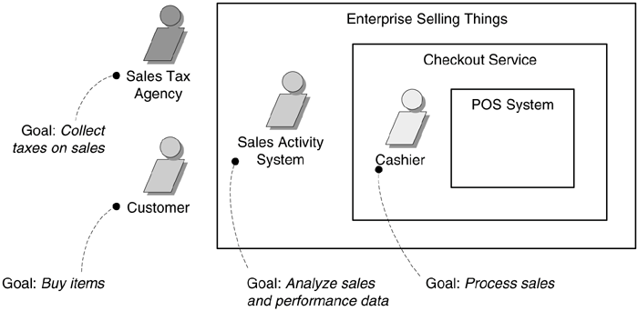 如果对被设计系统的边界定义不清晰,那么可以通过此后对系统外部事物的定义加以明确。一旦定义了外部参与者,系统边界将变得清晰。