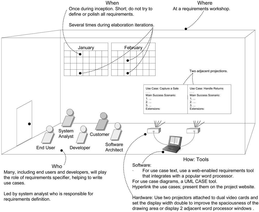 - 何时使用?确定并以摘要形式编写了大量用例后,在第一次需求讨论会中,详细地编写其中少量的具有重要架构意义和高价值的用例。