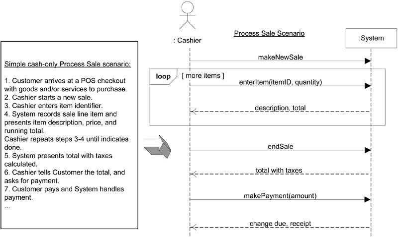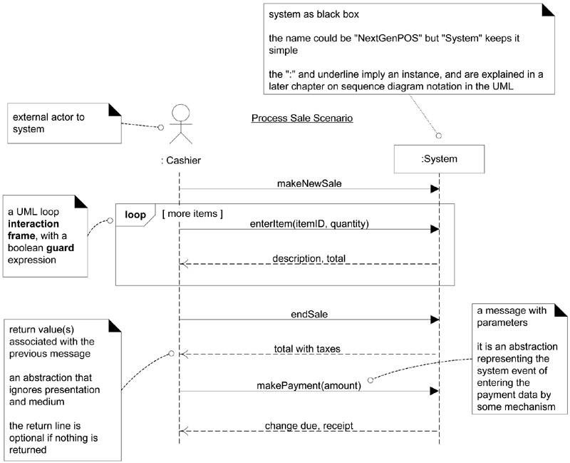 UML没有定义所谓的“系统”顺序图,而只是定义了“顺序图”。这一限定强调将系统的应用视为黑盒。之后,我们会在另一个语境下使用顺序图,阐述完成工作的交互软件对象的设计。